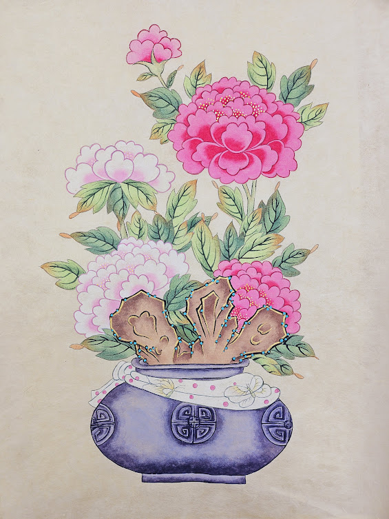 오늘은 순지에 라인을 따서 밑작업을 한 모란·연꽃·화병 민화를 통해, 이 세 가지 문양에 담긴 의미를 살펴본다.